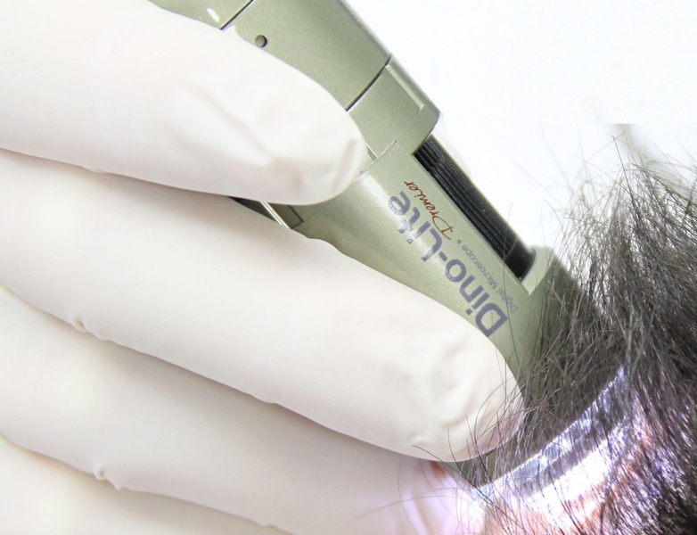 The Dino-Lite TrichoScope Basic (MEDL3H) is a great instrument for the examination of the human scalp and for hair analysis, e.g. for hair loss research. The special cone shaped cap allows easy separation of hair on the human head. With the high magnification of up to 200 times a single hair can be viewed with great detail.